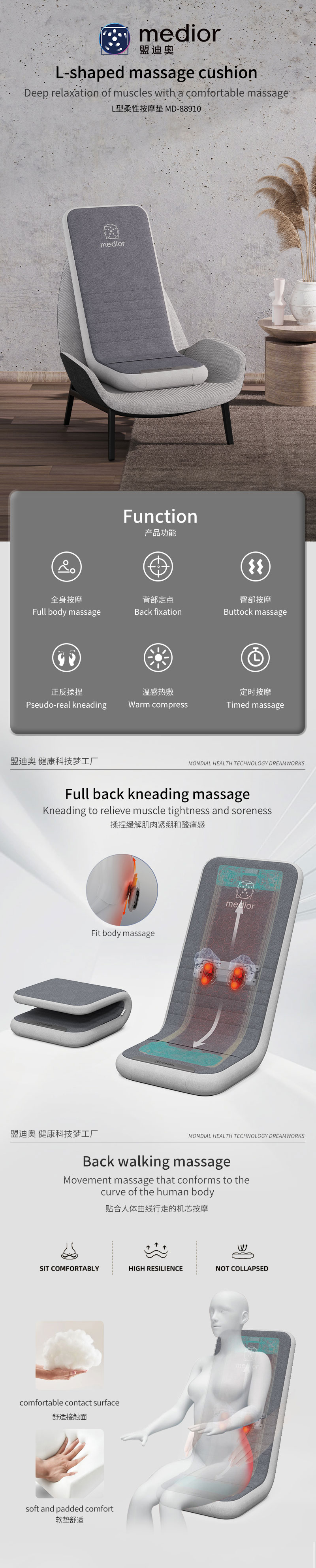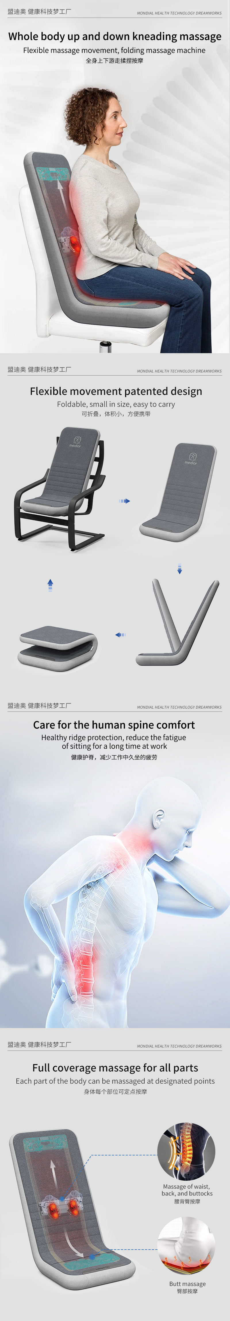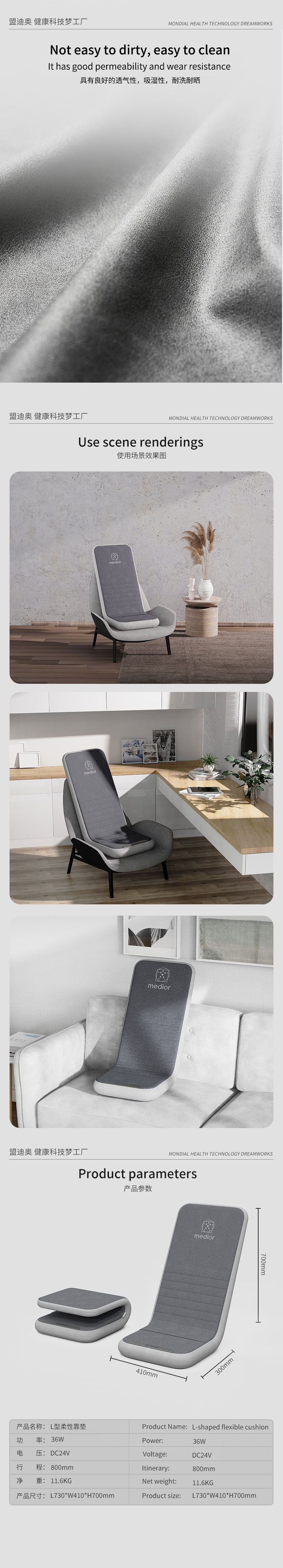 3、力度三檔調(diào)節(jié),定點按摩,腰背按摩、臀腿按摩、全背按摩模式選擇