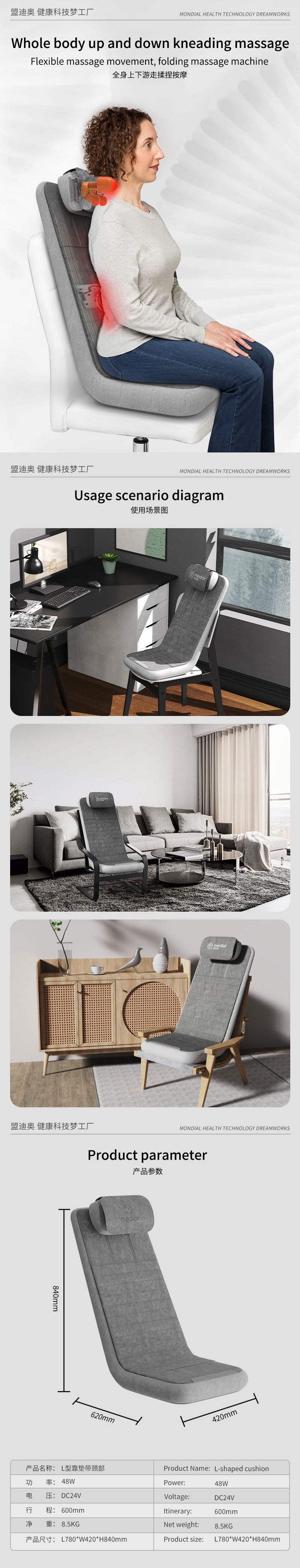 1、L型機(jī)芯結(jié)構(gòu),對折包裝縮小體積2、獨(dú)家專利柔性機(jī)芯3、力度三檔調(diào)節(jié),定點(diǎn)按摩,腰背按摩、臀腿按摩、全背按摩模式選擇4、背部行走揉捏,按摩區(qū)域加長到從肩膀到大腿;5、更加貼合不同款式的椅子整體可對折收納